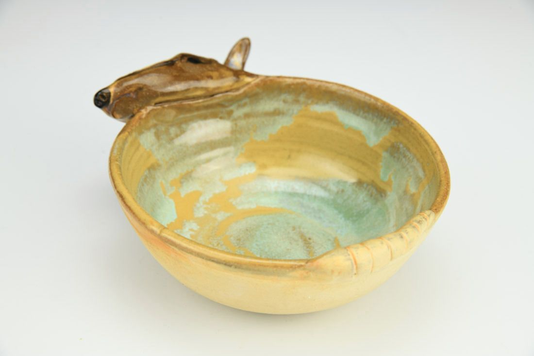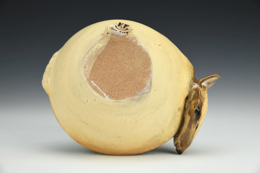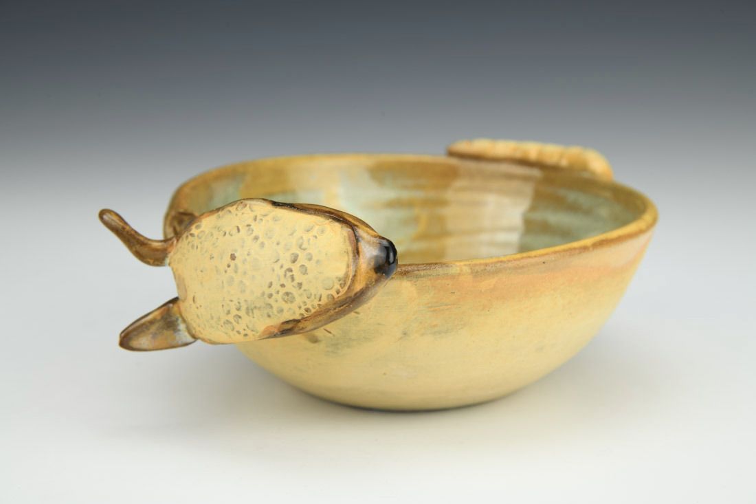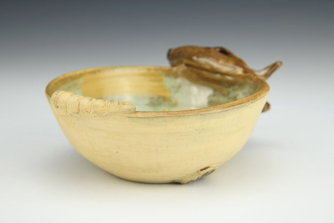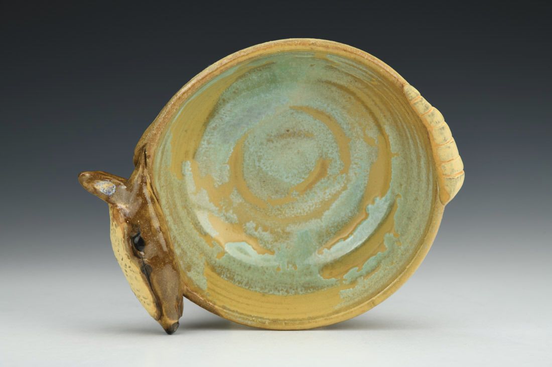 Stoneware, wheel thrown and hand built, cone 6 oxidation fired, 1.75 x 4.5 x 5 inches.