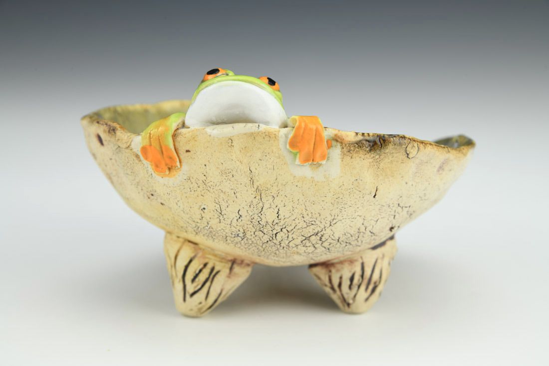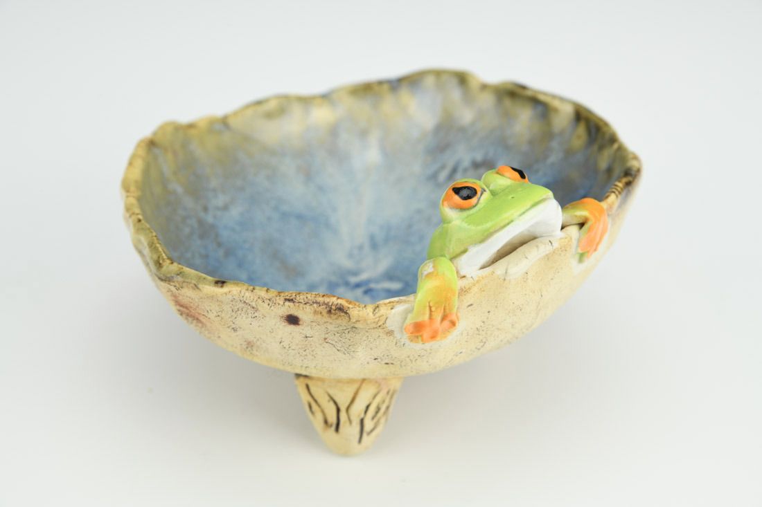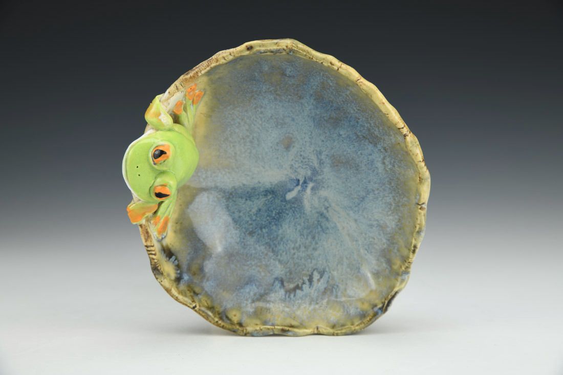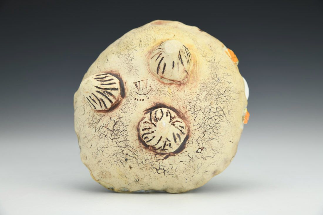 Stoneware, wheel thrown and hand built, cone 6 oxidation fired, 3 x 4.75 x 4.5 inches.