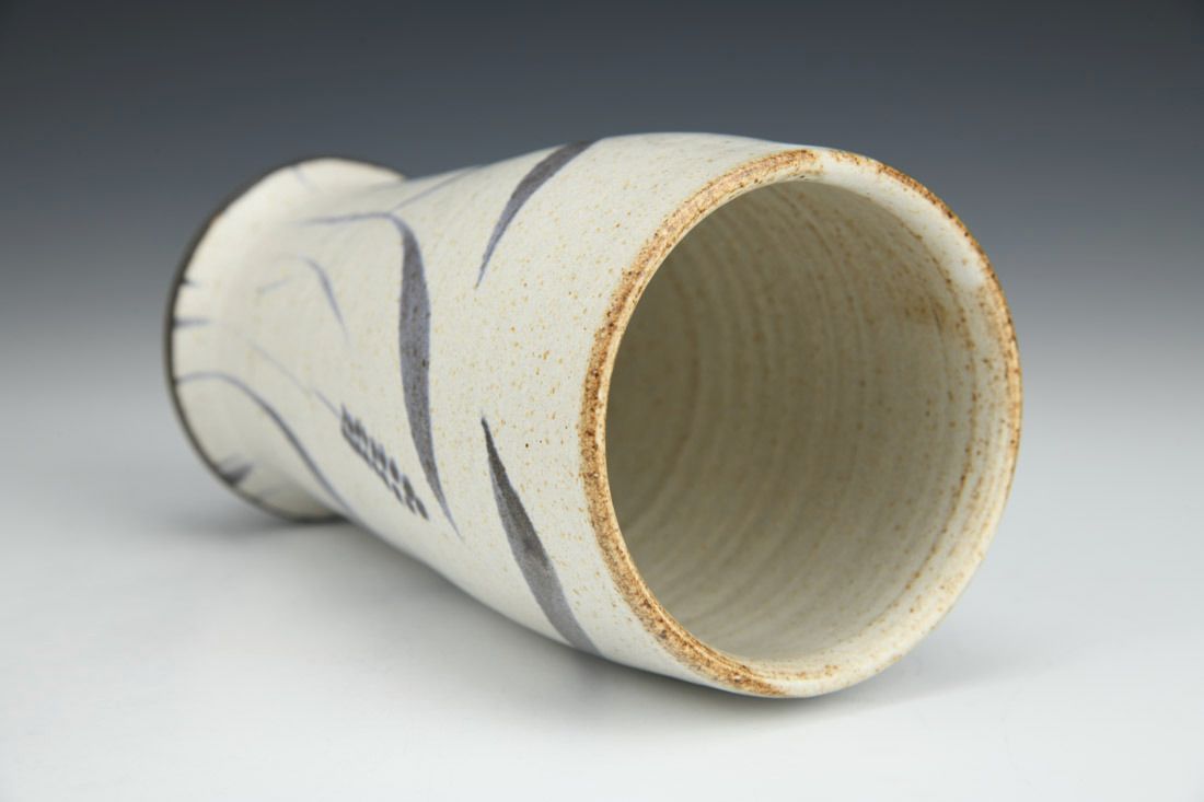 Dark stoneware, wheel thrown, oxide stain, matte white glaze, cone 6 electric fired, 6 x 3.5 x 3.5 inches.