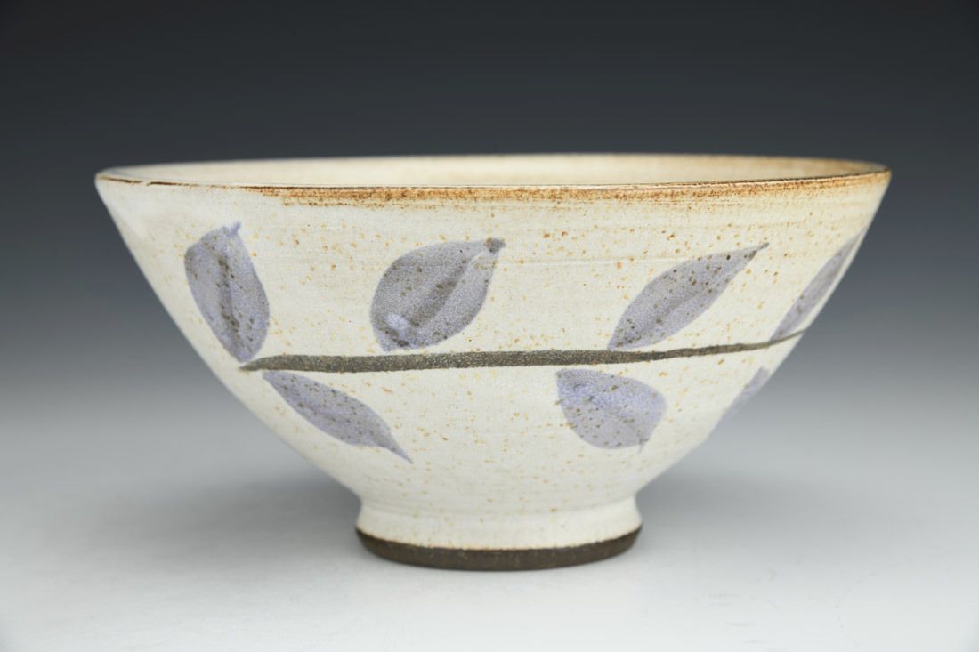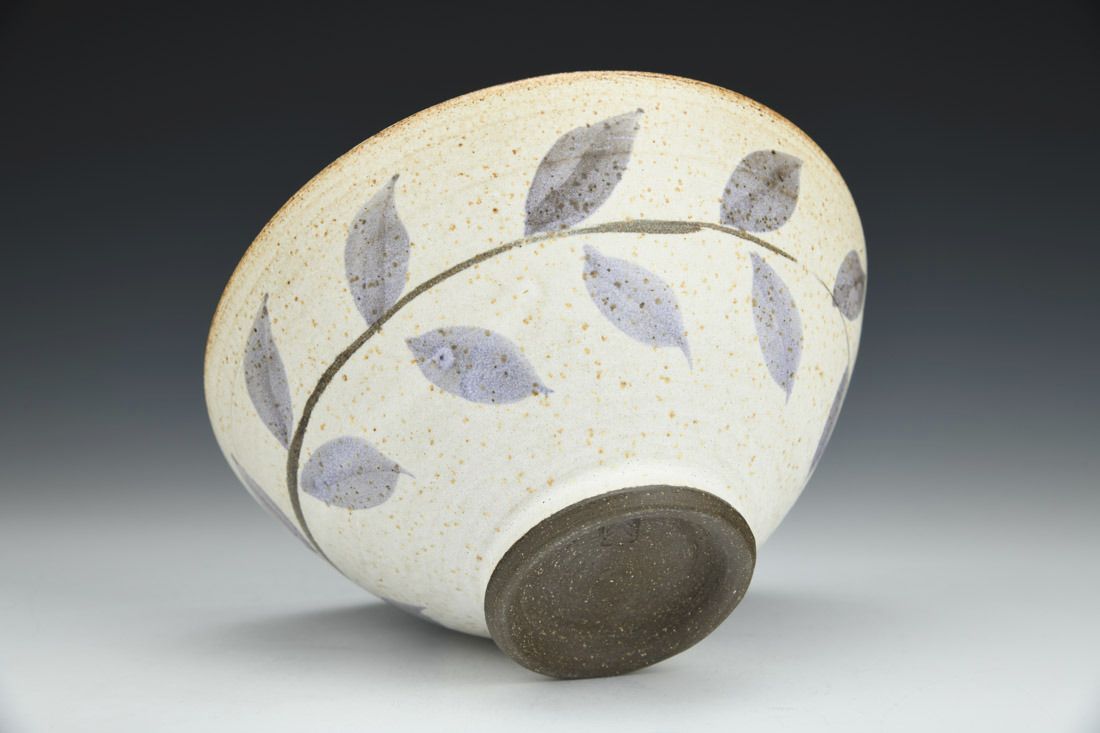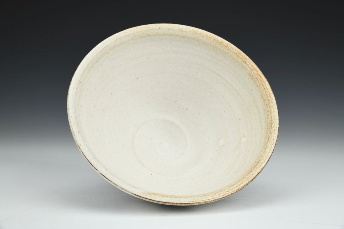 Dark stoneware, wheel thrown, oxide stain, matte white glaze, cone 6 electric fired, 3.5 x 6.75 x 6.75 inches.