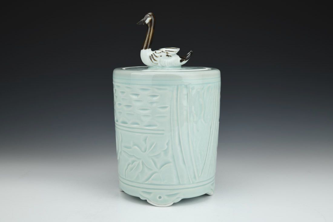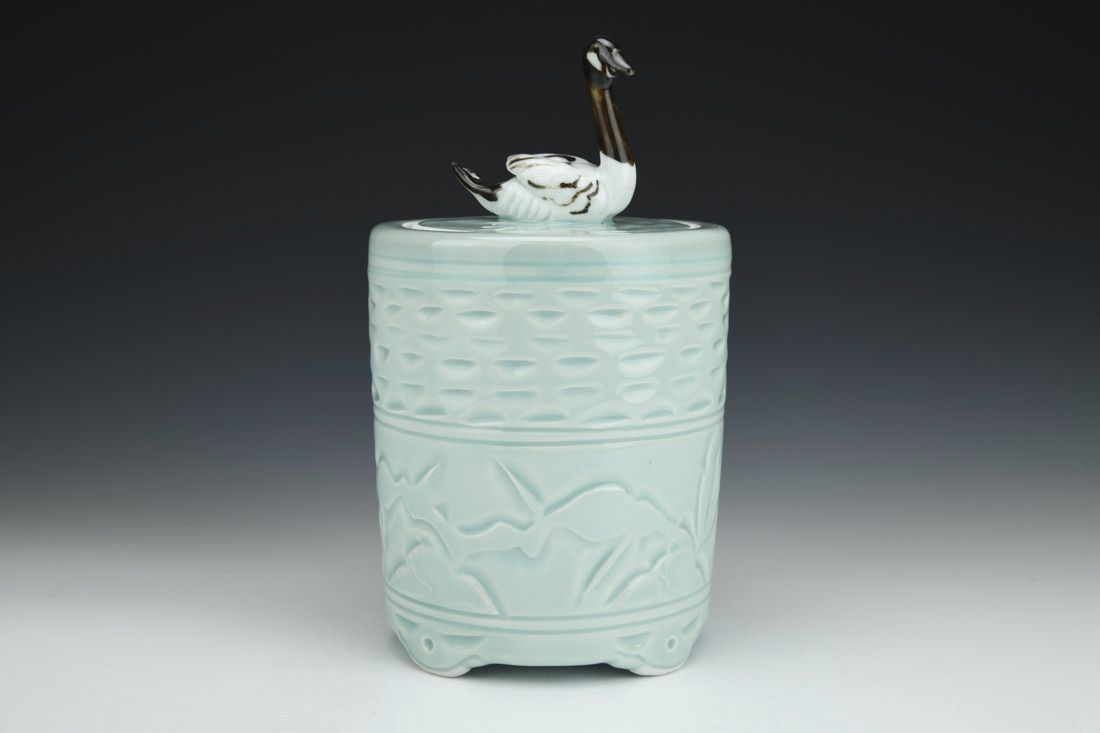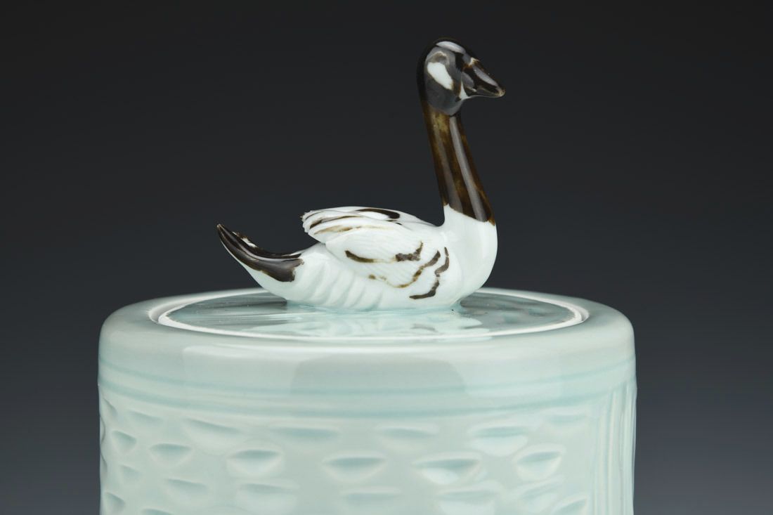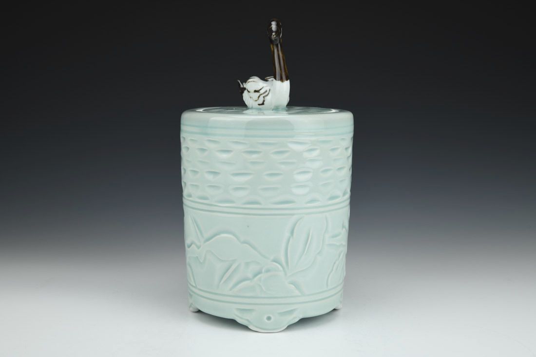 Porcelain, wheel thrown, carved, modeled, cone 10 fired, 9.75 x 6 x 6 inches.