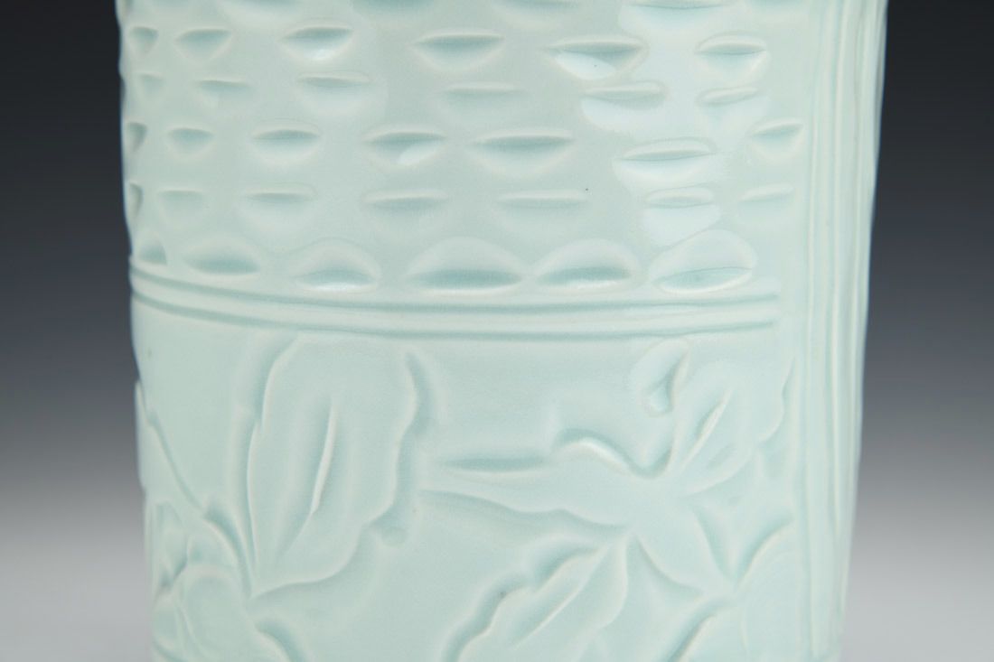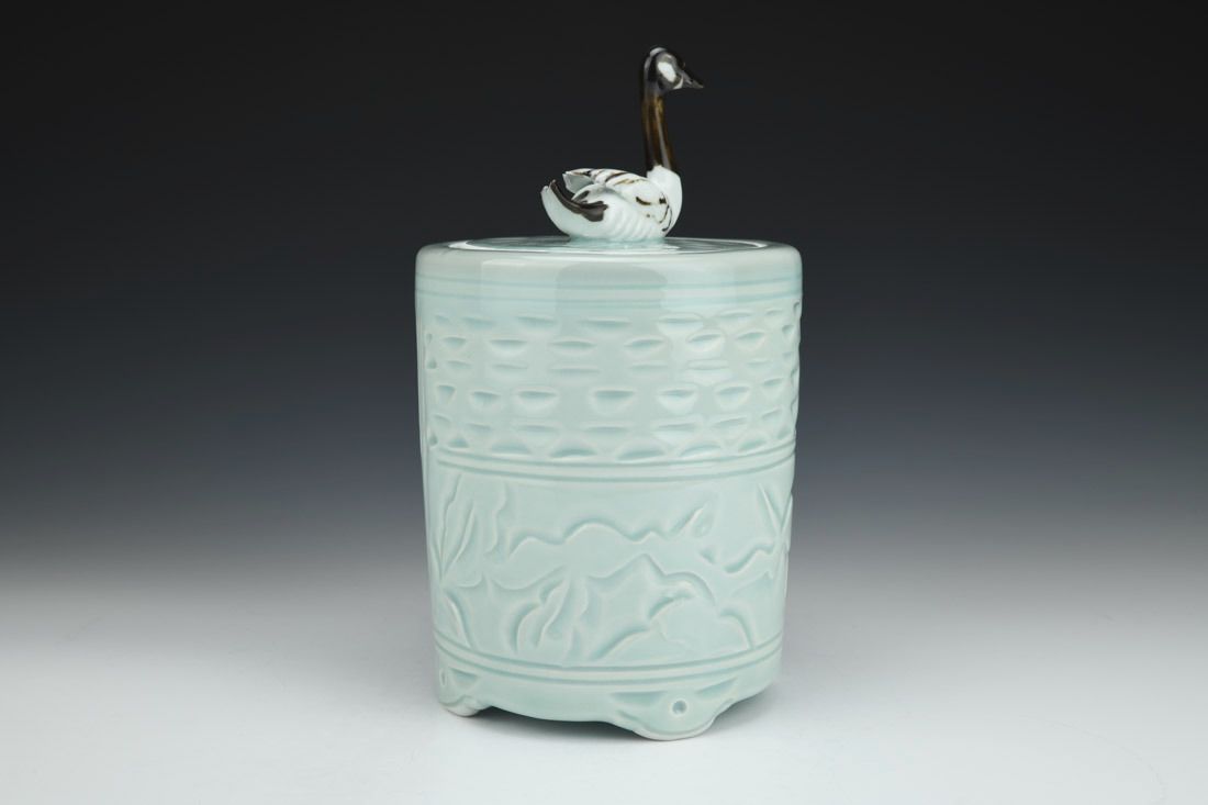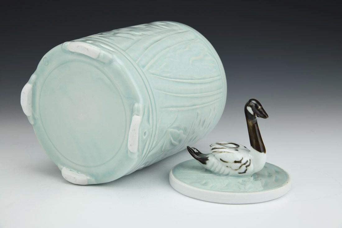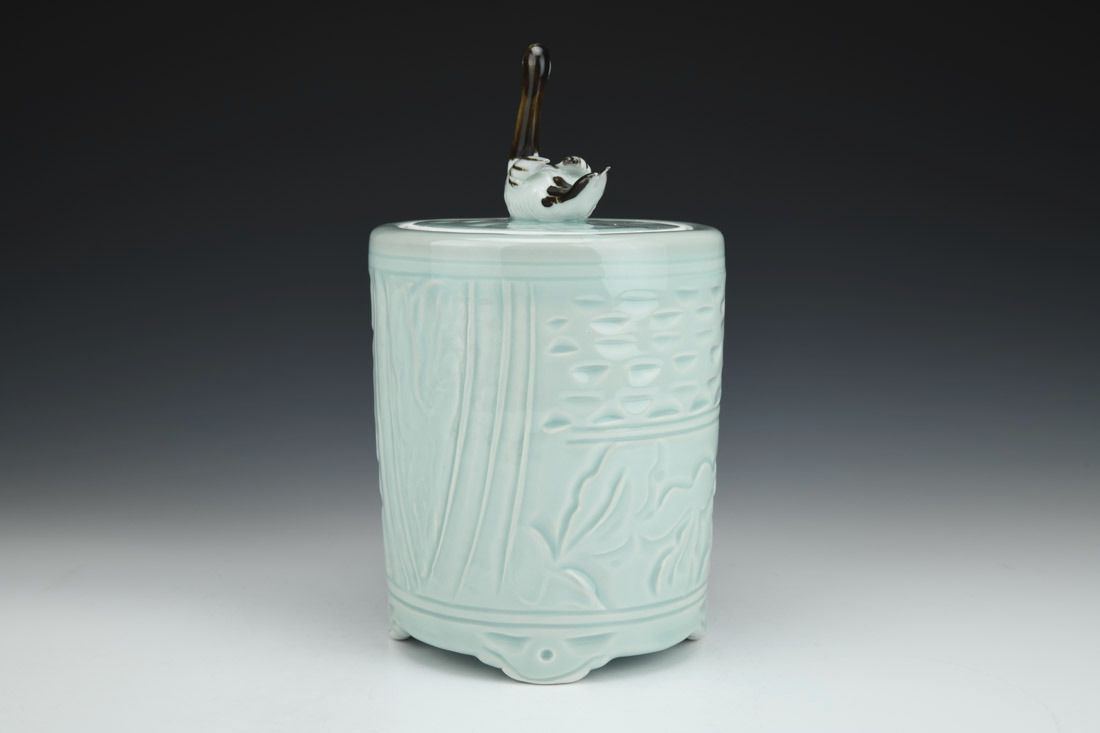 Porcelain, wheel thrown, carved, modeled, cone 10 fired, 9.75 x 6 x 6 inches.