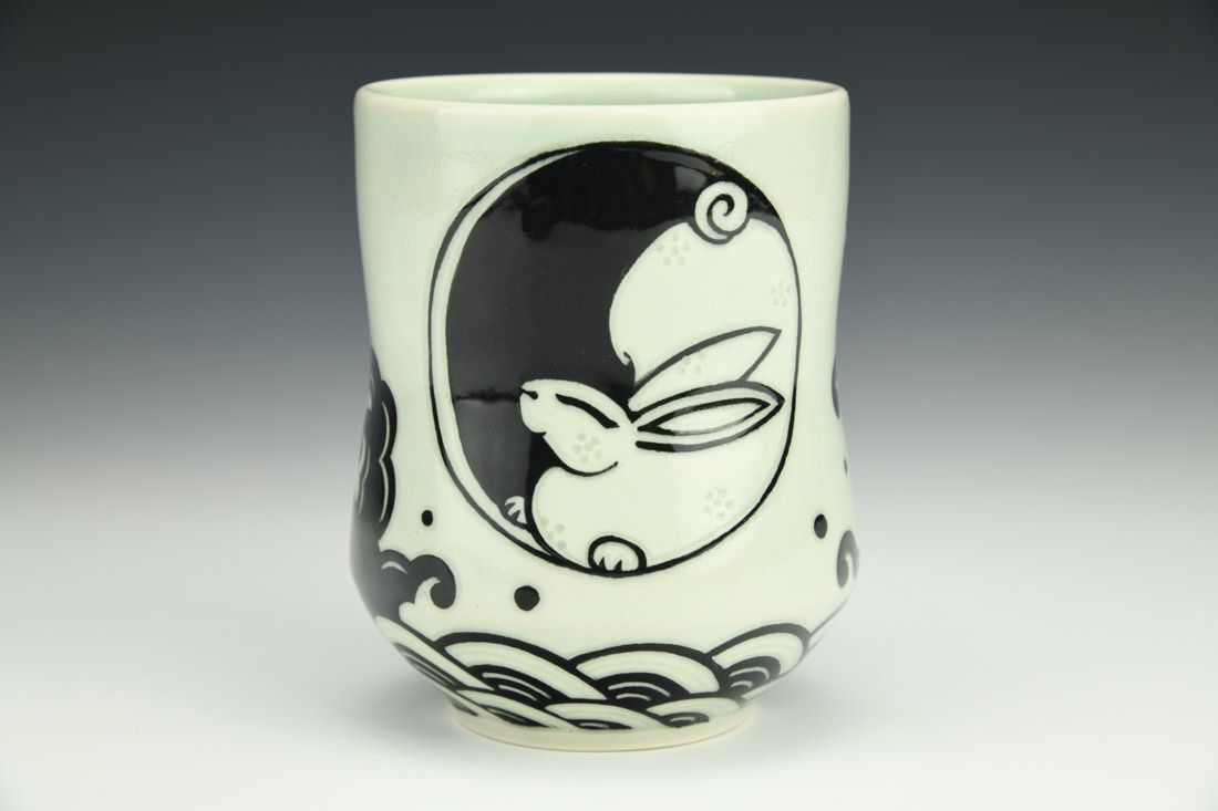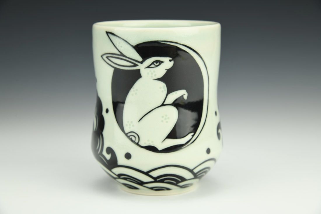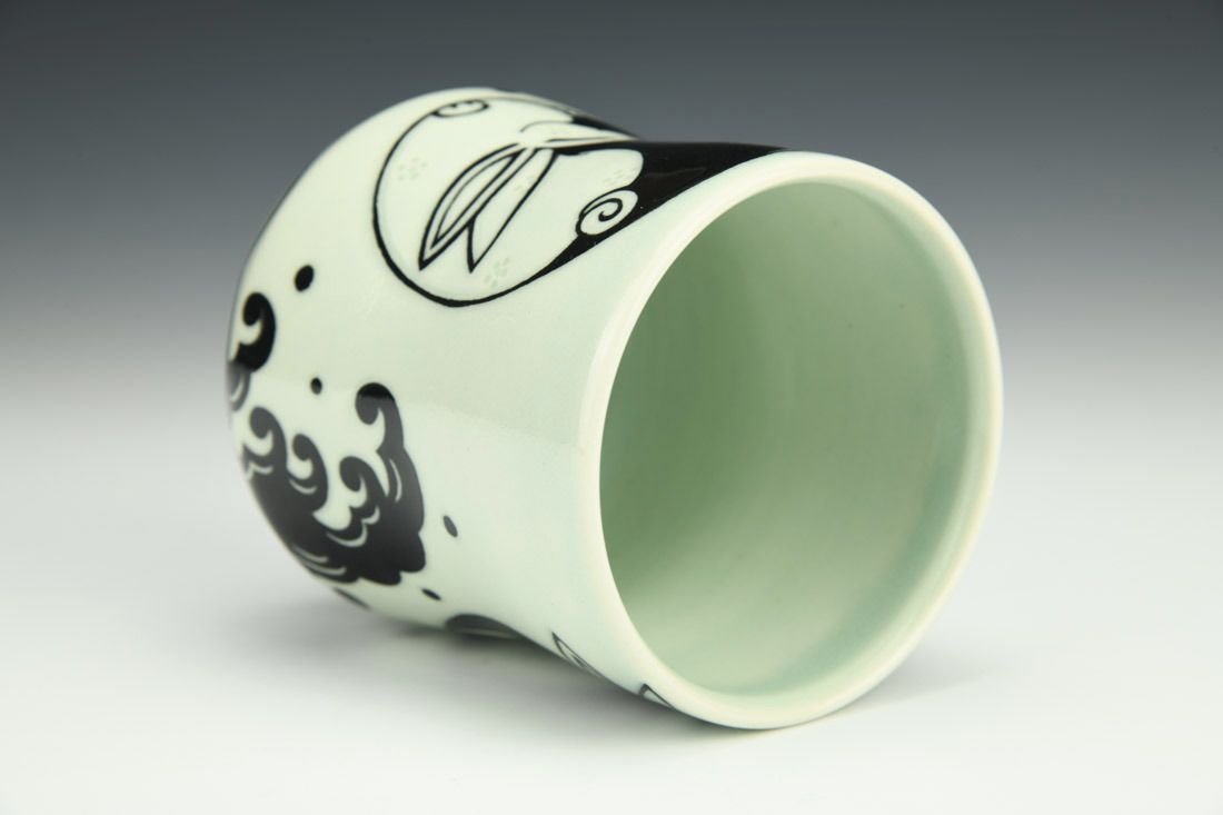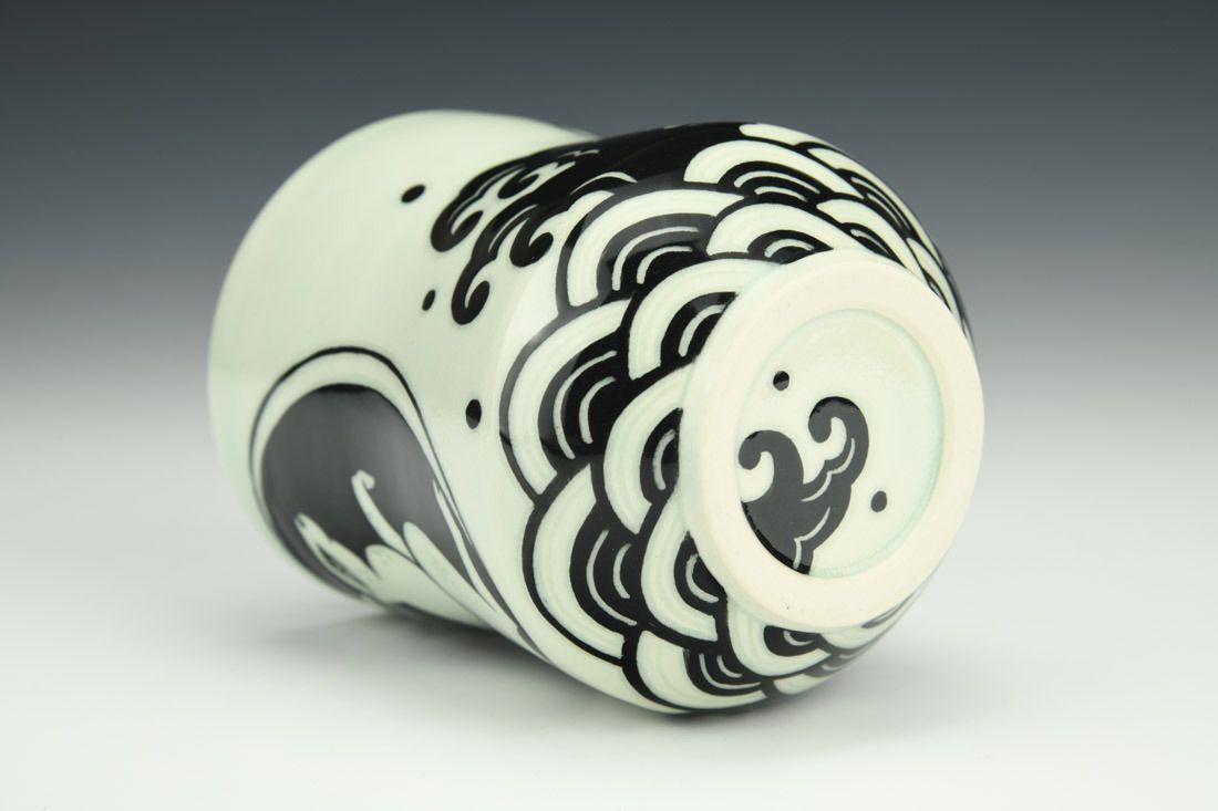 Mid-range porcelain, wheel thrown, carved, sgraffito, cone 5 electric fired, 4.75 x 3.75 x 3.75 inches.