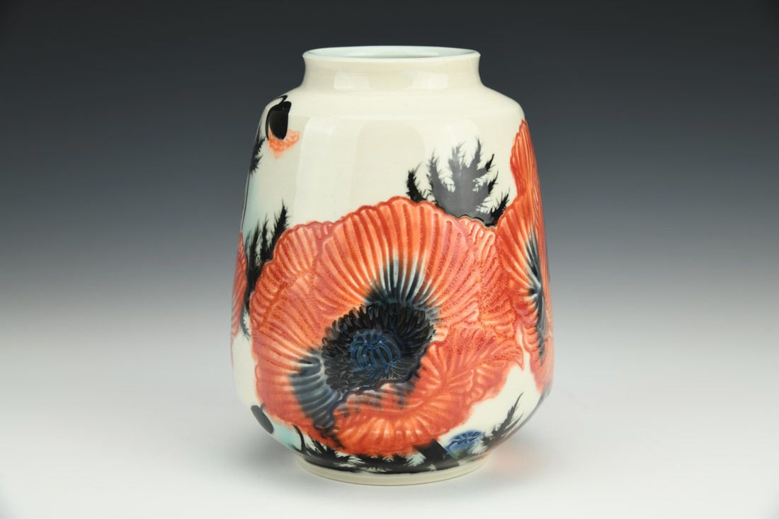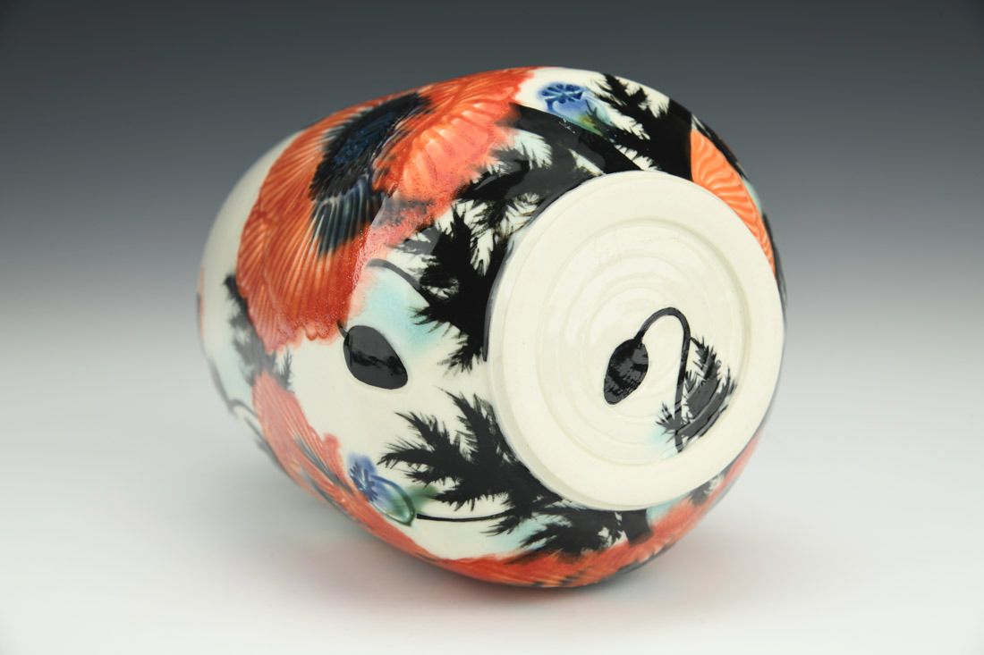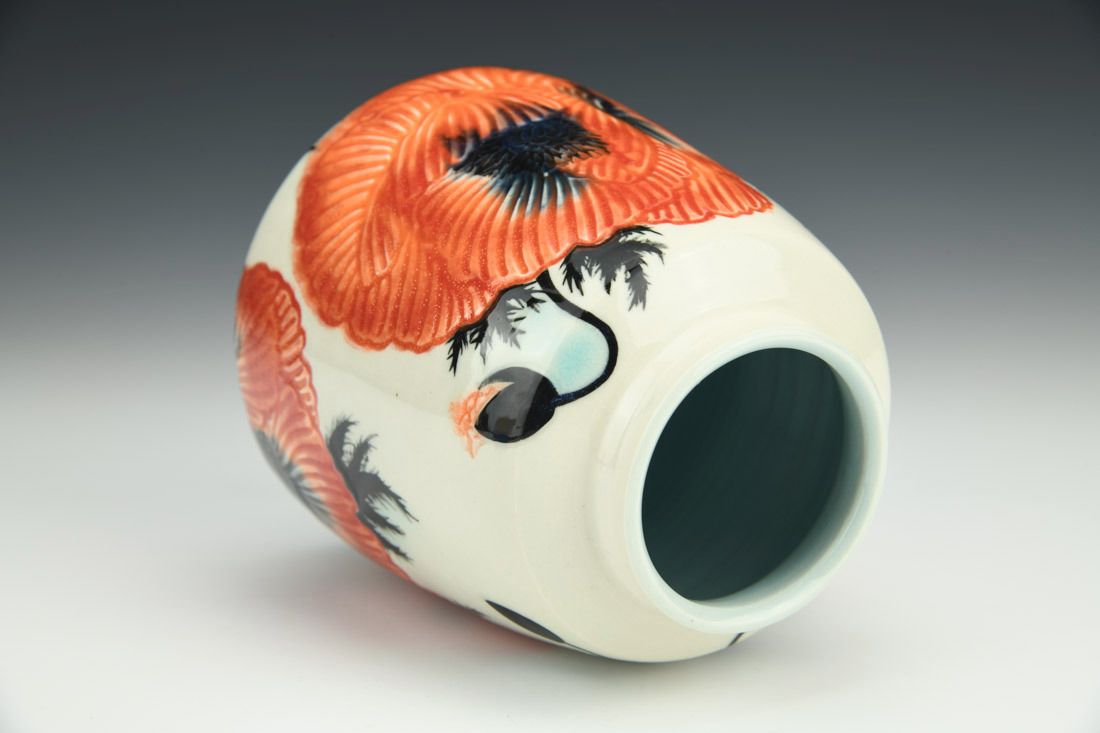 Mid-range porcelain, wheel thrown, carved, sgraffito, glaze painting, cone 5 electric fired, 6 x 4.25 x 4.25 inches.