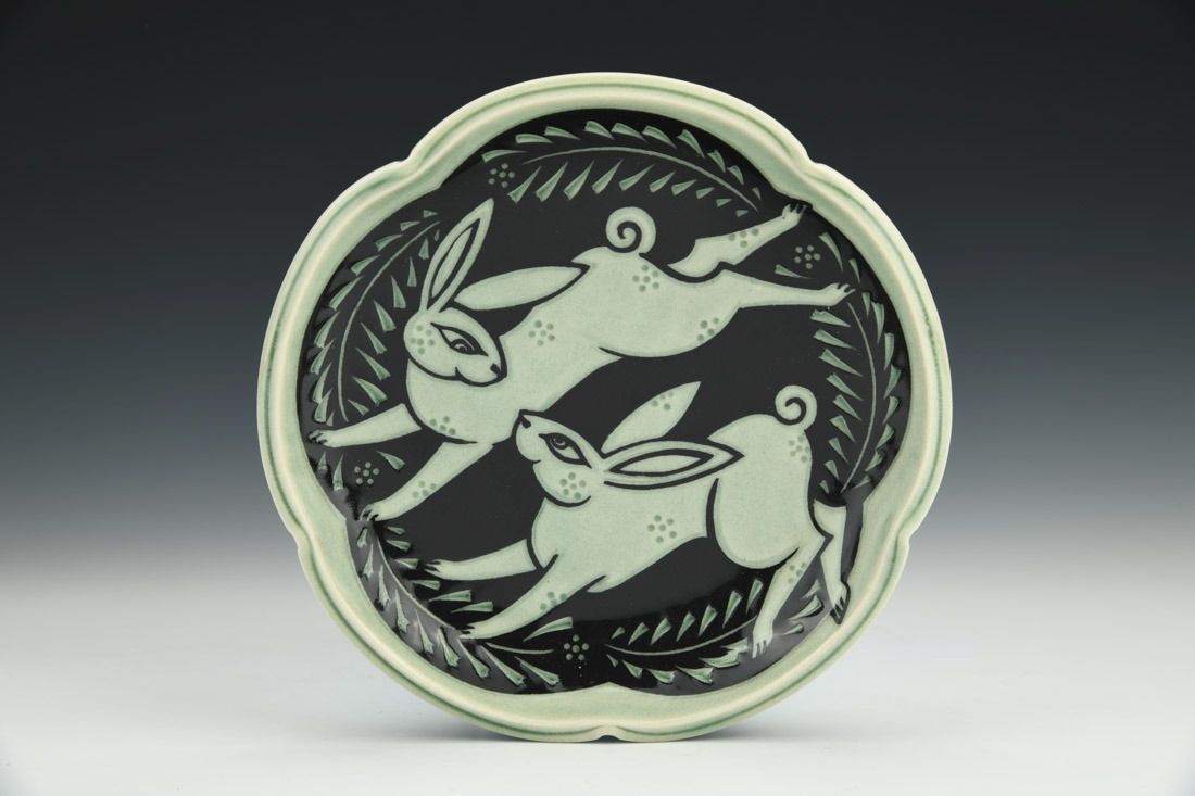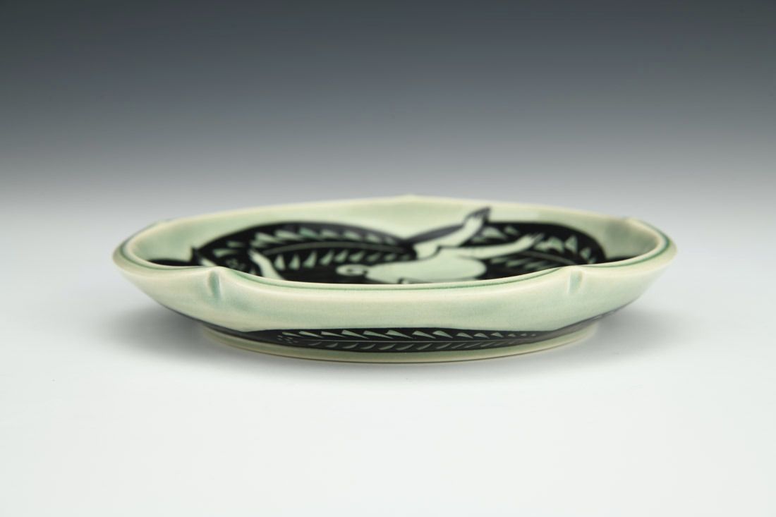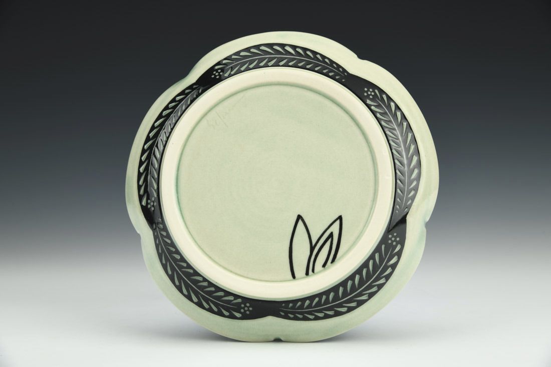 Mid-range porcelain, wheel thrown, carved, sgraffito, cone 5 electric fired, 1 x 5.75 x 5.75 inches.