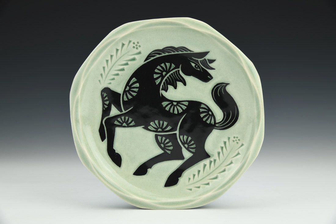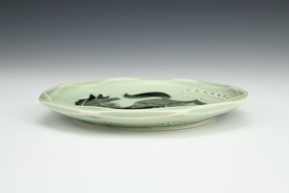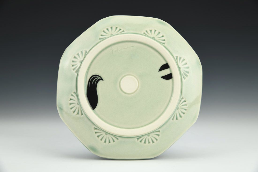Mid-range porcelain, wheel thrown, carved, sgraffito, cone 5 electric fired, 1 x 6 x 6 inches.