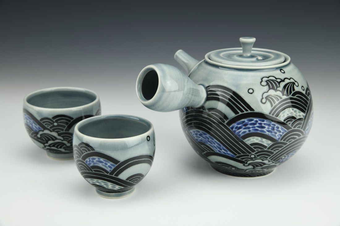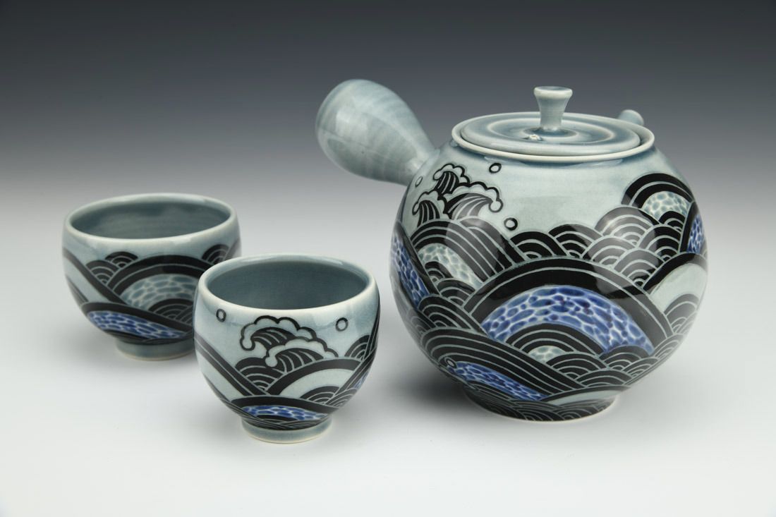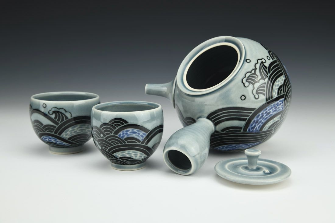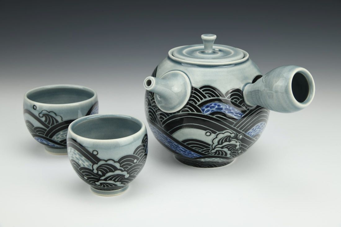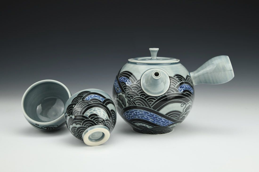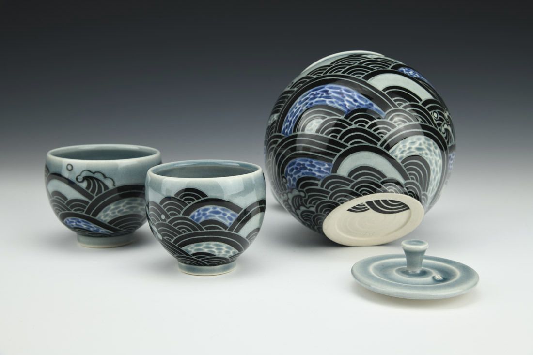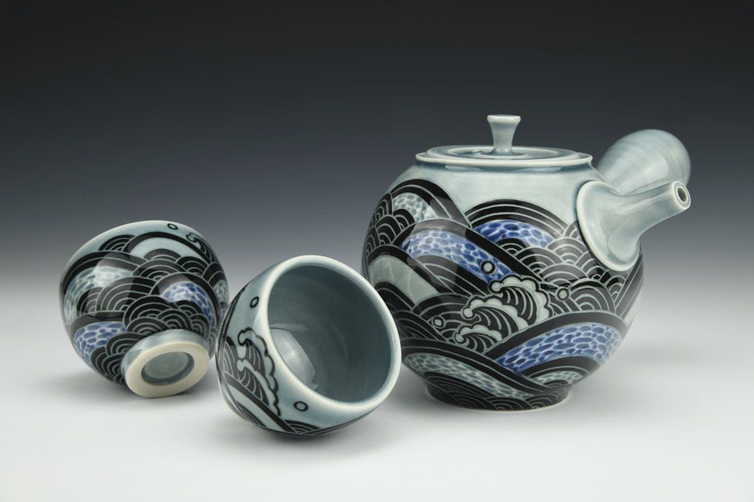 Mid-range porcelain, wheel thrown, carving, sgraffito, cone 5 electric fired, teapot: 5 x 7 x 5.5 inches.